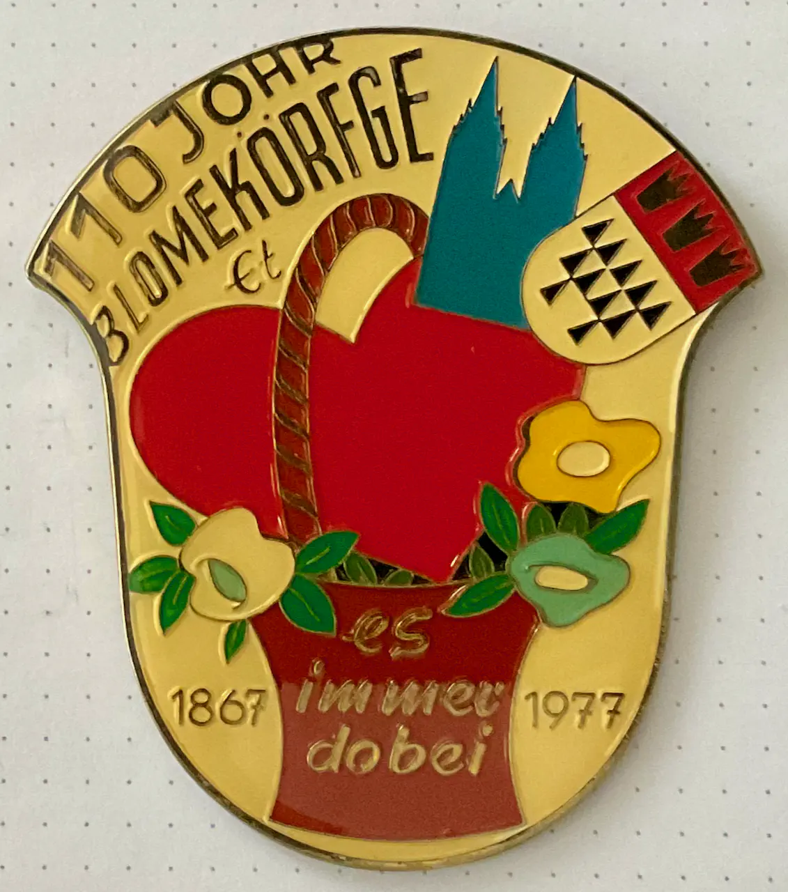 Startseite Archiv/ Physische Objekte im Archiv/ Orden, Pins und andere Anstecker/ Sessionsorden/ 110 Johr Blomekörfge et es immer dobei/ 110 Johr Blomekörfge et es immer dobei Sessionen: 1977 Motive:Blumenkorb mit großem Herz, Dom und Stadtwappen