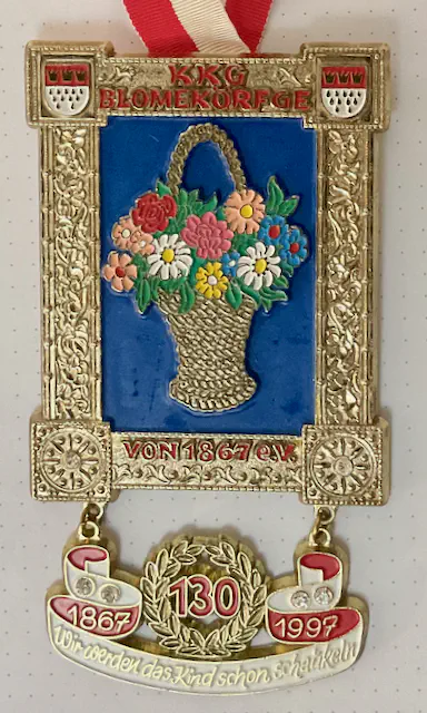 Startseite Archiv/ Physische Objekte im Archiv/ Orden, Pins und andere Anstecker/ Sessionsorden/ 130 Jahre K.K.G. Blomekörfge – Wir werden das Kind schon schaukeln/ 130 Jahre K.K.G. Blomekörfge – Wir werden das Kind schon schaukeln Sessionen: 1997 Motive:Gemälde von einem Blumenkorb Bewegliche Teile:unterer Teil mit Beschriftung