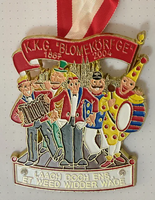 Startseite Archiv/ Physische Objekte im Archiv/ Orden, Pins und andere Anstecker/ Sessionsorden/ Laach doch ens, et weed widder wäde/ Laach doch ens, et weed widder wäde Sessionen: 2004 Motive:Karnevalisten mit Instrumenten um einen mit leeren Taschen