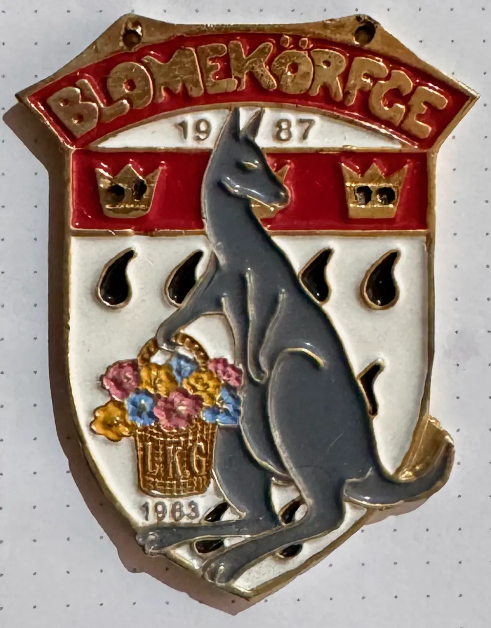 Startseite Archiv/ Physische Objekte im Archiv/ Orden, Pins und andere Anstecker/ Orden der LKG/ (Känguru vor Kölner Wappen)/ (Känguru vor Kölner Wappen) Sessionen: 1987 Schlagwörter: LKG Blomekörfge Motive:Kölner Stadtwappen, davor ein Känguru mit Blumenkorb