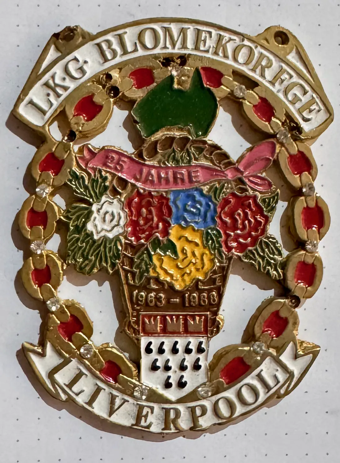 | Motive: | Kette mit Schmucksteinen, darin der Blumenkorb mit Kölner Stadtwappen und Banderole „25 Jahre“, darüber die Silhouette Australiens, Schriftzug „L.K.G. Blomekörfge Liverpool“ |