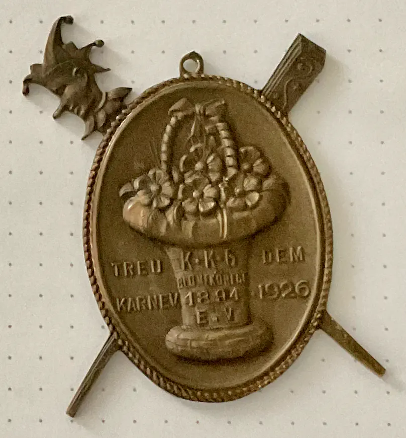 Startseite Archiv/ Orden/ Treu dem Karneval/ Treu dem Karneval Sessionen: 1926 Motive:Schild, Narrenstab, Prinzenkladde